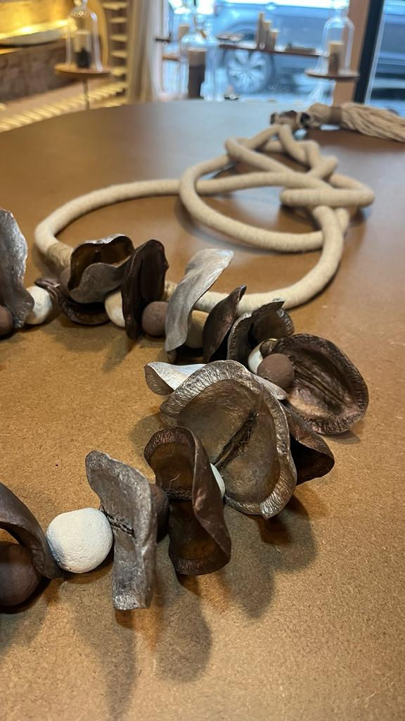 Confeccionado com concreto, corda, fio de algodão e cascas do fruto do jacarandá, é um produto que combina beleza e qualidade. O colar dedorativo concreto tem um design moderno e elegante, que valoriza qualquer ambiente. Ele pode ser usado como centro de mesa, vaso de flores, porta-velas, como uma decoração elegante ou simplesmente como um objeto de decoração. O Colar Concreto Sementes Brasileiras Mency Ateliê é um produto único e exclusivo da marca, que vai encantar você e seus convidados.